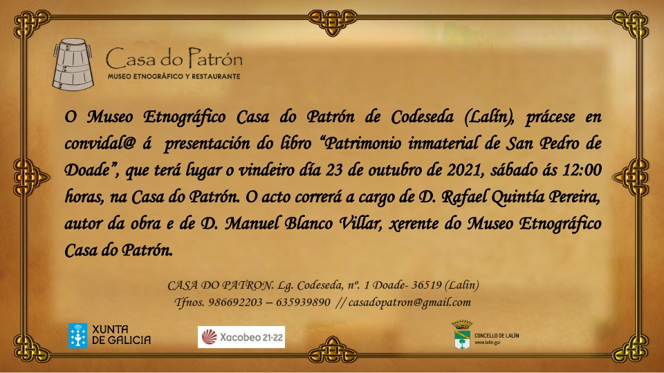 Este sábado 23 de outubro preséntase o meu último libro “Patrimonio Inmaterial de San Pedro de Doade”, froito do traballo de campo levado a cabo nesta parroquia do concello de Lalín. A investigación etnográfica e a publicación da monografía foi promovida polo Museo Etnográfico Casa do Patrón.
